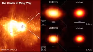 Izquierda, región del centro galáctico observada con MeerKAT y SARAO. A la derecha, los resultados de las observaciones de EAVN en longitudes de onda de 1.3 y 0.7 centímetros que muestran la estructura casi circular de Sagitario A*. - IAA-CSIC