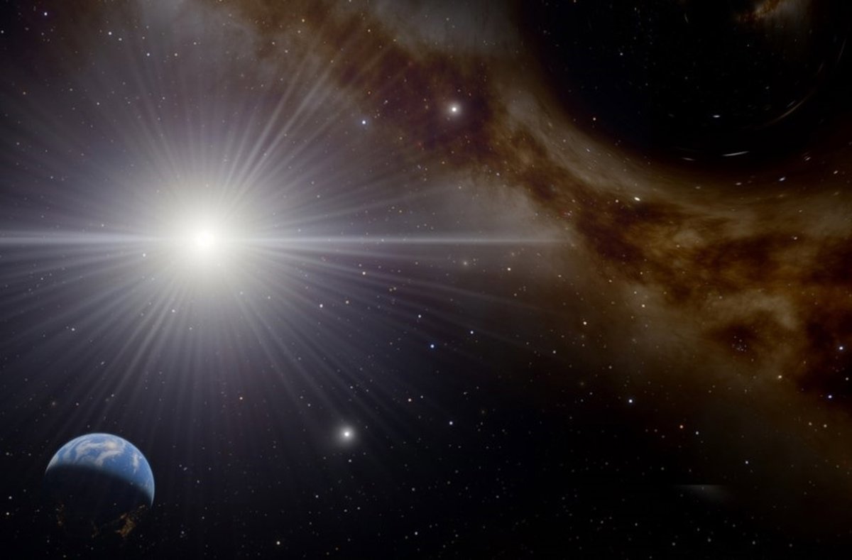Ilustración que muestra un pequeño agujero negro dentro de nuestra galaxia, la Vía Láctea (arriba a la derecha), que podría emitir una explosión de partículas energéticas debido a la radiación de Hawking, algunas de las cuales se detectarían en la Tierra - TOBY GLEASON-KAISER/COSMOGRAPHIC SOFTWARE LLC