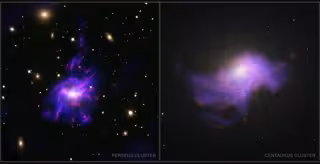 Las imágenes muestran dos de los cúmulos de galaxias en el estudio, el cúmulo de Perseo y el cúmulo de Centauro. Los datos de Chandra representados en azul revelan rayos X de filamentos de gas caliente, y los datos del VLT, un telescopio óptico en Chile, muestran filamentos más fríos en rojo.