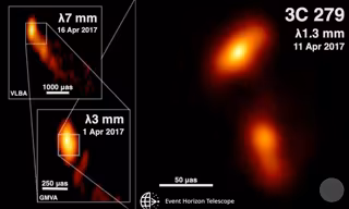La colaboración EHT --una red de telescopios coordinados por todo el mundo-- continúa extrayendo información de los datos innovadores recopilados en su campaña global en abril de 2017. Un objetivo de las observaciones fue una galaxia a 5.000 millones de años luz de distancia en la constelación de Virgo que los científicos clasifican como un cuásar debido a una fuente ultra luminosa de La energía en su centro brilla y parpadea cuando el gas cae en un agujero negro gigante. El objetivo, 3C 279, contiene un agujero negro aproximadamente mil millones de veces más masivo que nuestro Sol. Dos chorros gemelos de plasma en forma de manguera de fuego brotan del agujero negro y del sistema de discos a velocidades cercanas a la velocidad de la luz: una consecuencia de las enormes fuerzas desatadas a medida que la materia desciende a la inmensa gravedad del agujero negro.