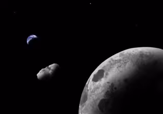 Impresión artística del cuasi satélite de la Tierra Kamo`oalewa cerca del sistema Tierra-Luna. Usando el gran telescopio binocular, los astrónomos han demostrado que podría ser un fragmento perdido de la luna. - ADDY GRAHAM/UNIVERSITY OF ARIZONA