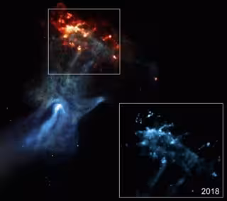 Desde la explosión, el remanente de supernova --hecho de los escombros de la estrella destrozada, más la onda expansiva de la explosión-- y la nebulosa de rayos X han ido cambiando a medida que se expanden hacia el espacio. En particular, el remanente de supernova y la nebulosa de rayos X ahora se asemejan a la forma de dedos y palma.