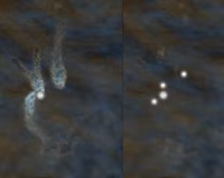 El sistema estelar se compone de una estrella joven todavía en una fase inicial de desarrollo y tres nubes de gas que se están condensando rápidamente por las fuerzas gravitacionales.