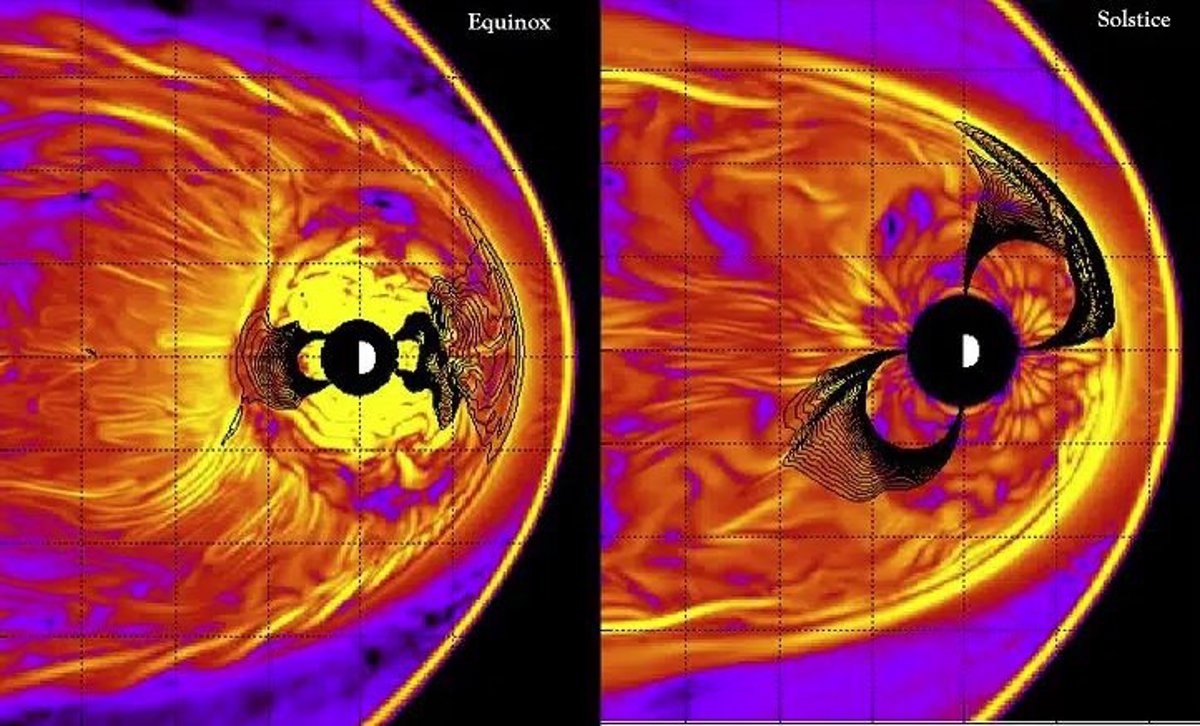 Estas ondas rompientes, conocidas como ondas de Kelvin-Helmholtz, ocurren en el límite entre el viento solar y el escudo magnético de la Tierra. Las ondas ocurren con mucha más frecuencia durante las temporadas de primavera y otoño, informaron los investigadores, mientras que la actividad es escasa durante el verano y el invierno.