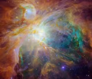 Remolinos gaseosos de hidrógeno, azufre e hidrocarburos acunan una colección de nuevas estrellas en esta imagen compuesta de la Nebulosa de Orión, vista por los telescopios espaciales Hubble y Spitzer.