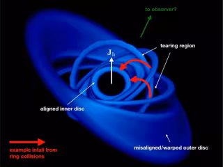 La observación concuerda estrechamente con el trabajo teórico reciente, también en Leicester y el uso de la instalación de supercomputadora Dirac del Reino Unido que simula el "desgarro" de los discos de acreción desalineados. Este trabajo ha demostrado que los anillos de gas pueden romperse y colisionar entre sí, cancelando su rotación y dejando que el gas caiga directamente hacia el agujero negro.
