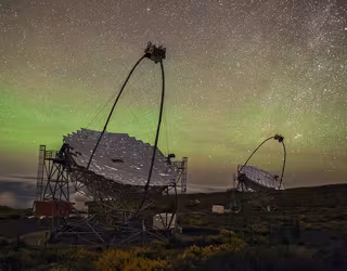 Los telescopios MAGIC se encuentran en el Observatorio Roque de los Muchachos, en La Palma (Islas Canarias). MAGIC, un sistema de dos telescopios Cherenkov de 17m de diámetro, es actualmente uno de los tres principales instrumentos atmosféricos Cherenkov de imagen en el mundo. Está diseñado para detectar fotones de decenas de miles de millones a decenas de billones de veces más enérgico que la luz visible. MAGIC también utiliza una técnica novedosa para reducir el efecto de la luz de la luna en la cámara, permitiendo observaciones durante las noches de luna moderada.
