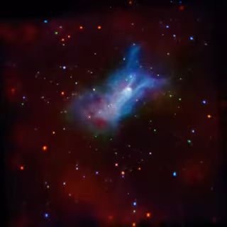 El remanente de supernova G327.1-1.1, que se encuentra en alrededor de 29.000 años luz de la Tierra, es otro espectacular campo de escombros que queda cuando una estrella masiva explota. La imagen de Chandra muestra el movimiento hacia el exterior, o hacia adelante, por ondas de choque (visto como el color rojo débil), y una nebulosa de viento púlsar brillante (azul). La nebulosa de viento púlsar se parece haber sido distorsionada por la acción combinada de la onda de choque inversa y por el movimiento del púlsar.