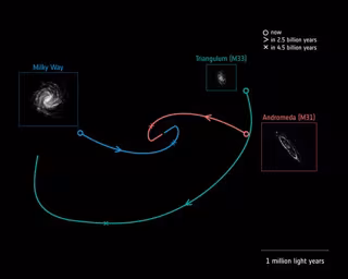 "Las velocidades que encontramos muestran que M33 (Triángulo) no puede estar en una órbita larga alrededor de M31 (Andrómeda)", dice la coautora de la investigacón Ekta Patel de la Universidad de Arizona, EE. UU. "Nuestros modelos implican unánimemente que M33 debe estar en su primera inmersión en M31".