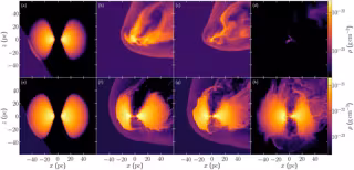 Visualizaciones del modelo dinámico simulando dos escenarios diferentes. La fila superior muestra una colisión que reduce la actividad del núcleo, la fila inferior muestra una colisión que aumenta la actividad del núcleo. - MIKI ET AL.