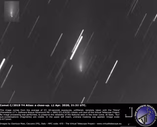 La imagen, del 12 de abril, proviene del promedio de 57 exposiciones de 60 segundos, tomadas de forma remota con una unidad robótica incluida en el Virtual Telescope Project. El telescopio siguió el movimiento aparente del cometa y las imágenes se apilaron utilizando la órbita del cometa, para proporcionar la mejor precisión. La escala de la imagen es 0,63 segundos de arco por píxel.