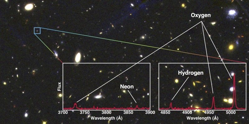 "MOSFIRE nos permitió observar varios objetos simultáneamente con una sensibilidad exquisita, lo que nos permite recoger los espectros de muchas galaxias de modo muy eficiente", dijo. "Vimos una serie de características espectrales emitidas por los átomos ionizados en las galaxias, como el hidrógeno, el oxígeno y neón, lo que nos permitió determinar el contenido de metales de las galaxias".