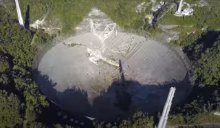 Archivo - Imagen de dron del radiotelescopio de Arecibo tras su colapso - YOUTUBE/D.A.S. DRONES PÉREZ - Archivo