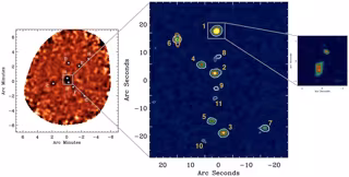 APEX es un radiotelescopio de 12m de diámetro en el desierto de Atacama en Chile, que se estableció como un primer paso en el proyecto ALMA, un grupo de 66 radiotelescopios de 7m y 22m en la misma área. El resultado fue el descubrimiento de una concentración de galaxias polvorientas en el universo temprano. Están a punto de fusionarse para formar el centro de un futuro cúmulo de galaxias masivas.