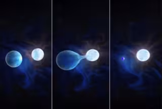 Impresión artística de una estrella masiva que despoja la envoltura de hidrógeno de su compañera en un sistema binario, dejando atrás un núcleo expuesto, caliente y rico en helio. - NAVID MARVI, COURTESY OF THE CARNEGIE INSTITUTION