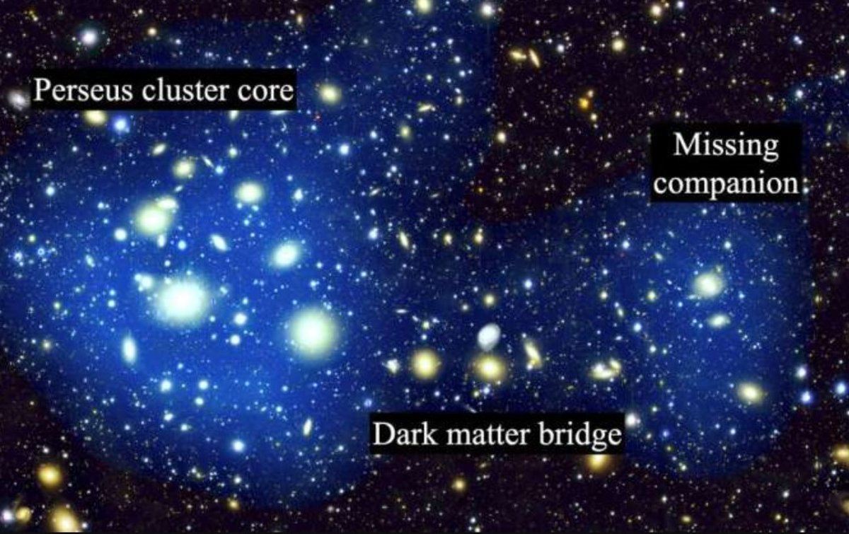 Mediante esta técnica, los investigadores identificaron una masa masiva de materia oscura, con una masa aproximada de 200 billones de masas solares, ubicada a unos 1,4 millones de años luz al oeste del núcleo del cúmulo. Sorprendentemente, esta estructura está conectada al núcleo del cúmulo de Perseo por un tenue pero estadísticamente significativo "puente de materia oscura", lo que proporciona evidencia directa de la interacción gravitacional pasada entre ellos.
