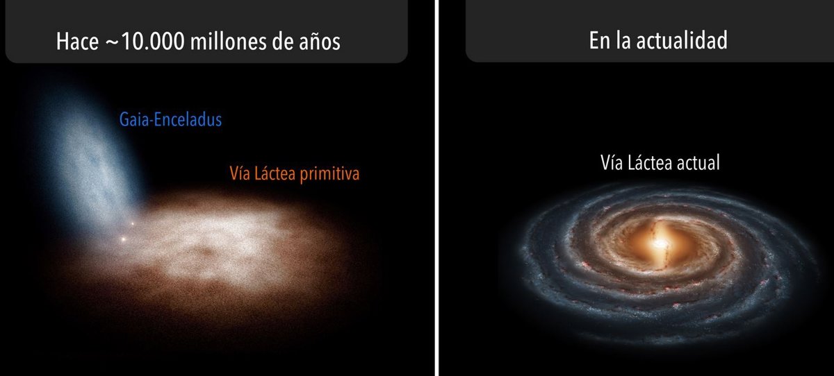 Hace 13.000 millones de años se empezaron a formar estrellas en dos sistemas estelares diferenciados que luego se fusionaron: una galaxia enana llamada Gaia-Encélado y otro, el progenitor principal de nuestra galaxia, unas cuatro veces más masivo y con mayor cantidad de metales. El sistema más masivo sufrió hace 10.000 millones de años un violento impacto con Gaia-Encélado. Como consecuencia, algunas de sus estrellas y las pertenecientes a Gaia-Encélado adquirieron movimientos caóticos, pasando a formar parte del halo de la Vía Láctea. Tras ello, se sucedieron violentos brotes de formación estelar hasta hace 6.000 millones de años, cuando el gas se asentó en el disco de nuestra galaxia dando lugar al conocido como disco fino.