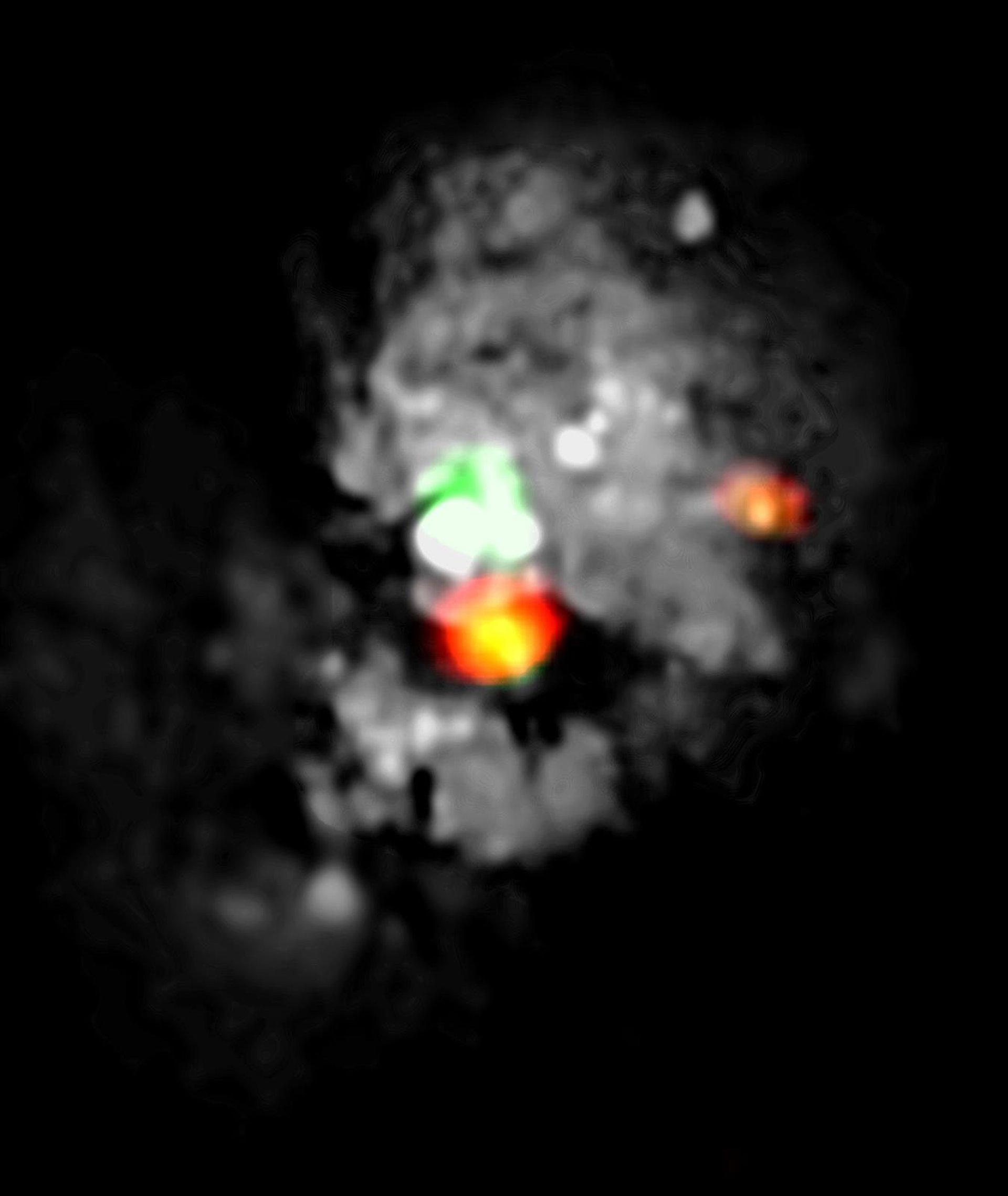 Las observaciones del Instituto de Radioastronomía Milimétrica revelan una región gigante (de unos 500 años luz de diámetro) de reciente formación de estrellas masivas en el centro del 'Ojo de Medusa', la región central rica en gas de la Fusión de la Medusa. Las estrellas todavía están envueltas en sus nubes polvorientas de nacimiento y completamente ocultas a la vista en luz visible.