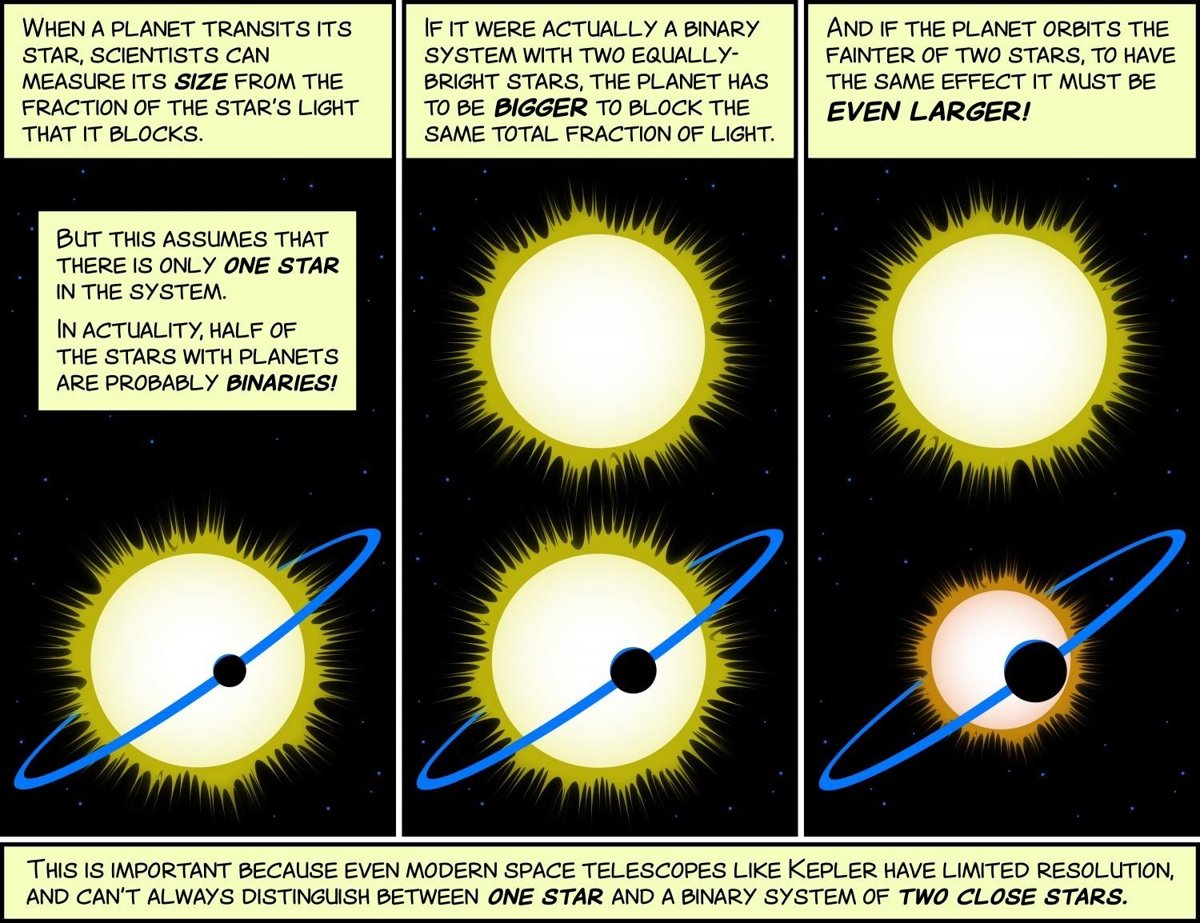 Si hay dos estrellas en el sistema, el telescopio mide la luz combinada de ambas estrellas. Pero un planeta en órbita alrededor de una de estas estrellas hará que sólo uno de ellas oscurezca. Así que, si no sabes que hay una segunda estrella, subestimarás el tamaño del planeta.
