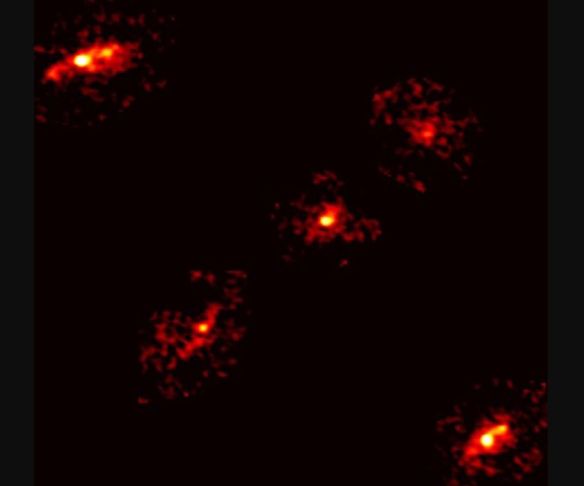 Una rara configuración cósmica: los científicos han descubierto una cruz de Einstein con cinco puntos de luz, en lugar de los cuatro habituales. - P. COX ET AL. – ALMA (ESO/NAOJ/NRAO)