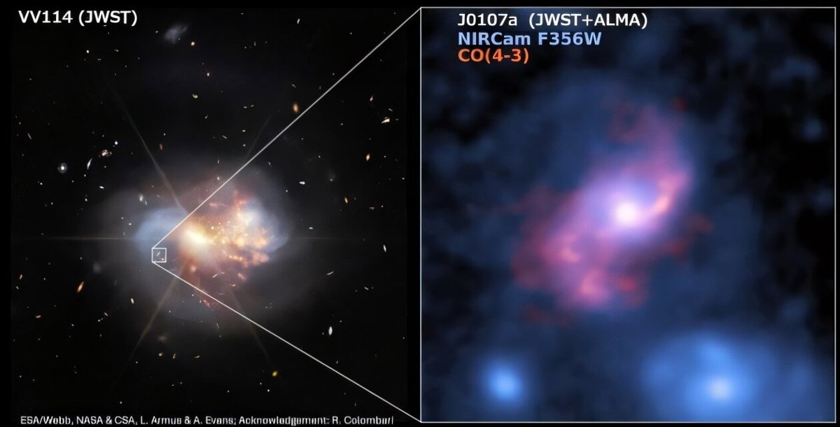 Izquierda: Imagen en el infrarrojo cercano de una galaxia cercana VV114 y la monstruosa galaxia espiral barrada de fondo J0107a en z=2,433 capturada por el telescopio espacial James Webb. Derecha: Distribución estelar y molecular de gases de J0107a - NASA, ALMA(ESO/NAOJ/NRAO), HUANG ET AL