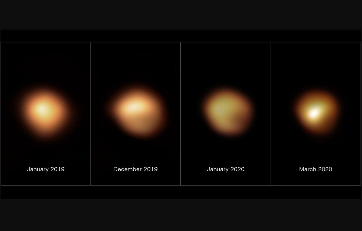 Desde octubre de 2019 hasta marzo de 2020, Betelgeuse demostró un oscurecimiento misterioso, capturando la atención y la imaginación tanto de los astrónomos como del público. Si bien es una estrella variable que exhibe cambios de luz periódicos y a veces irregulares, esta atenuación fue la más significativa observada en los últimos 50 años. Se volvió más débil en más de 2,5 veces, lo que incluso se puede notar a simple vista en el cielo nocturno. Los astrónomos de todo el mundo han propuesto varios escenarios: fase previa a la explosión de una supernova, oscurecimiento del polvo o cambios en la fotosfera de la estrella.