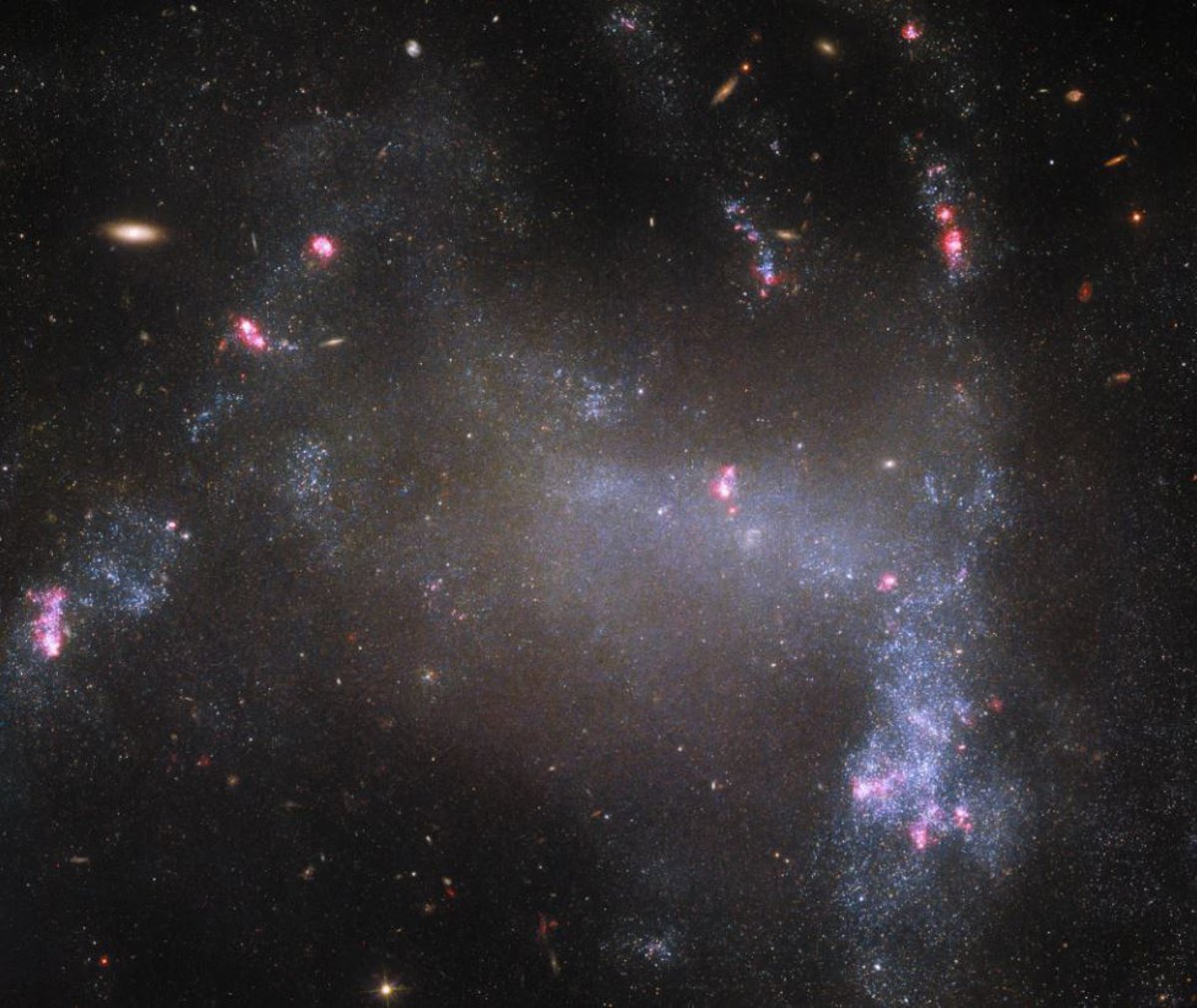El segundo programa utilizó la Cámara de Campo Amplio 3 del Hubble para observar cúmulos de estrellas en galaxias enanas. Sus observaciones aprovecharon las capacidades ultravioleta del Hubble junto con su capacidad para ver detalles finos para comprender mejor el entorno donde se forman las estrellas en las galaxias enanas. Las regiones de formación estelar de UGC 5829 son fácilmente visibles en esta imagen como nebulosas o nubes de color rosa brillante.