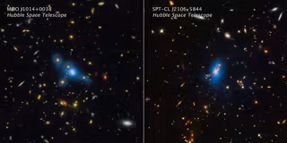 Aquí se muestran imágenes del telescopio espacial Hubble de dos cúmulos masivos de galaxias denominados MOO J1014+0038 (panel izquierdo) y SPT-CL J2106-5844 (panel derecho). El color azul añadido artificialmente se traduce a partir de datos del Hubble que captaron un fenómeno llamado luz intracúmulo. Este resplandor extremadamente tenue traza una suave distribución de luz procedente de estrellas errantes dispersas por el cúmulo. Hace miles de millones de años, las estrellas se desprendieron de sus galaxias progenitoras y ahora vagan a la deriva por el espacio intergaláctico.