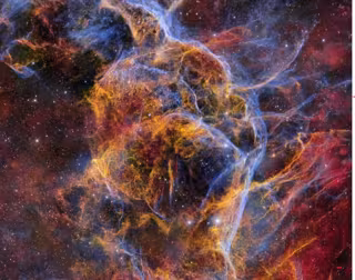 El remanente de Supernova Vela es simplemente el fantasma de una estrella masiva que alguna vez existió. Cuando la estrella explotó hace 11.000 años, sus capas exteriores fueron arrancadas violentamente y arrojadas a la región circundante, generando un choque de ondas que hasta hoy todavía es visible. A medida que el choque de ondas se expande hacia la región circundante, el gas caliente y energizado se aleja del punto de detonación, comprimiéndose e interactuando con el medio interestelar para producir los filamentos fibrosos azules y amarillos que se ven en la imagen. El remanente de Supernova Vela es una estructura gigantesca, que abarca casi 100 años luz y se extiende hasta veinte veces el diámetro de la Luna llena en el cielo nocturno.