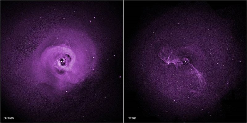 Estudios previos muestran los agujeros negros supermasivos, centrados en las grandes galaxias, en el centro de los cúmulos de galaxias. Éstos bombean grandes cantidades de energía a su alrededor en potentes chorros de partículas energéticas que crean huecos en el gas caliente. Chandra y otros telescopios de rayos X, han detectado estos huecos gigantes antes.