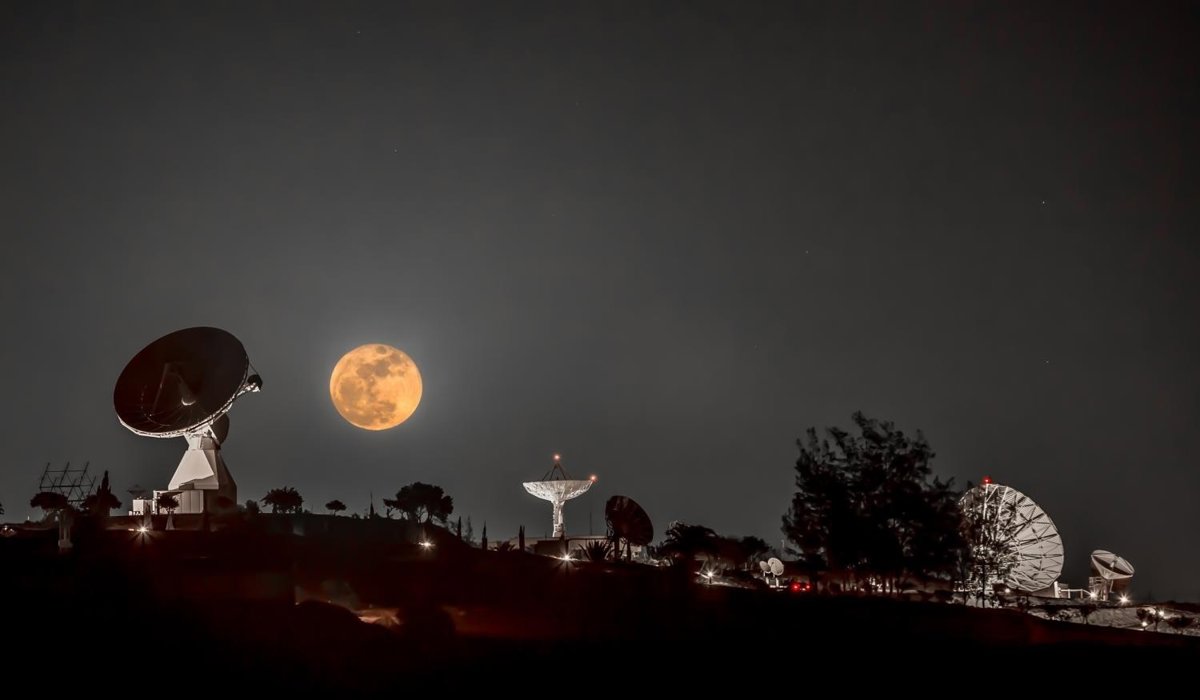Esta imagen muestra cómo la Luna llena se cierne sobre un conjunto de antenas de seguimiento de satélites del Instituto Nacional de Técnica Aeroespacial (INTA) en Montaña Blanca, Gran Canaria.