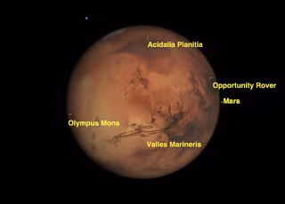La imagen de arriba muestra cómo aparecerá Marte a la vista de un buen telescopio en el momento exacto de máxima aproximación. El lugar de aterrizaje del rover Opportunity aparece al este, y el volcán más alto del Sistema Solar, Olympus Mons, está saliendo a la vista en la extremidad occidental, informa Space.com.