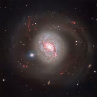 Esta pintoresca galaxia espiral parece tranquila, pero hay más de lo que parece. Messier 77 (también conocida como NGC 1068) es una de las galaxias activas más cercanas, unos de los objetos más espectaculares y energéticos del universo. Sus núcleos suelen ser lo suficientemente brillantes como para eclipsar a todo el resto de la galaxia.