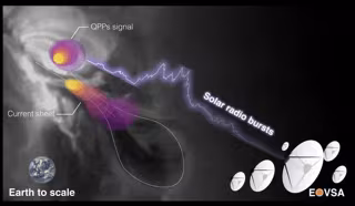 "Los patrones de repetición no son infrecuentes en las erupciones de radio solar", explica Kou. "Pero, curiosamente, hay una fuente secundaria que no esperábamos situada a lo largo de la lámina de corriente estirada que pulsa de forma similar a la fuente QPP principal".
