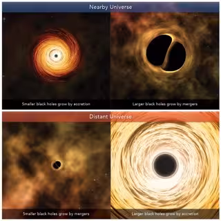 El estudio sugiere que el principal canal de crecimiento depende de la masa del agujero negro y del desplazamiento al rojo. En el universo cercano, los agujeros negros pequeños crecen principalmente por acreción, mientras que los agujeros negros muy grandes crecen principalmente a través de fusiones. En el universo muy lejano hay una inversión: pequeños agujeros negros crecen principalmente por fusiones, grandes agujeros negros por acreción.