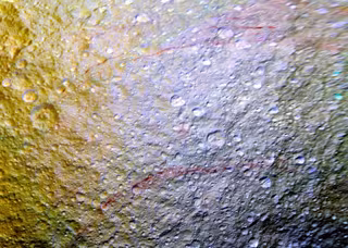 La NASA ha hallado sobre la superficie de Tetis, una de las lunas de Saturno, unas misteriosas manchas rojas de forma alargada, como si el terreno hubiera sufrido la 'agresión' de un grafitero. Las líneas forman un arco que para los científicos es "inexplicable".