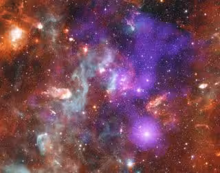 En la nueva imagen compuesta, los datos de Chandra (púrpura) muestran la emisión difusa de rayos X y las estrellas jóvenes en Cygnus OB2, y los datos infrarrojos del ahora retirado telescopio espacial Spitzer de la NASA (rojo, verde, azul y cian) revelan estrellas jóvenes y el polvo y el gas más fríos en toda la región.