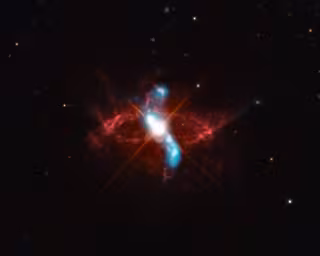 Los científicos creen que una explosión nova en el año 1073 produjo este anillo. La evidencia de esta explosión proviene de datos de telescopios ópticos, de registros coreanos de una estrella "invitada" en la posición de R Aquarii en 1073 e información de núcleos de hielo antárticos. Un anillo interno fue generado por una erupción hacia 1770. Los datos ópticos (rojo) en una nueva imagen compuesta de R Aquarii muestran el anillo interno. El anillo exterior es aproximadamente el doble de ancho que el anillo interior, pero es demasiado débil para ser visible en esta imagen.