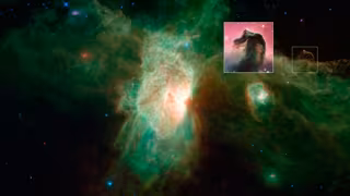 En las imágenes de luz visible, la nebulosa tiene una distintiva silueta con forma de caballo oscura y polvorienta, pero cuando se ve a la luz infrarroja, el polvo se vuelve transparente y la nebulosa aparece como un arco tenue.