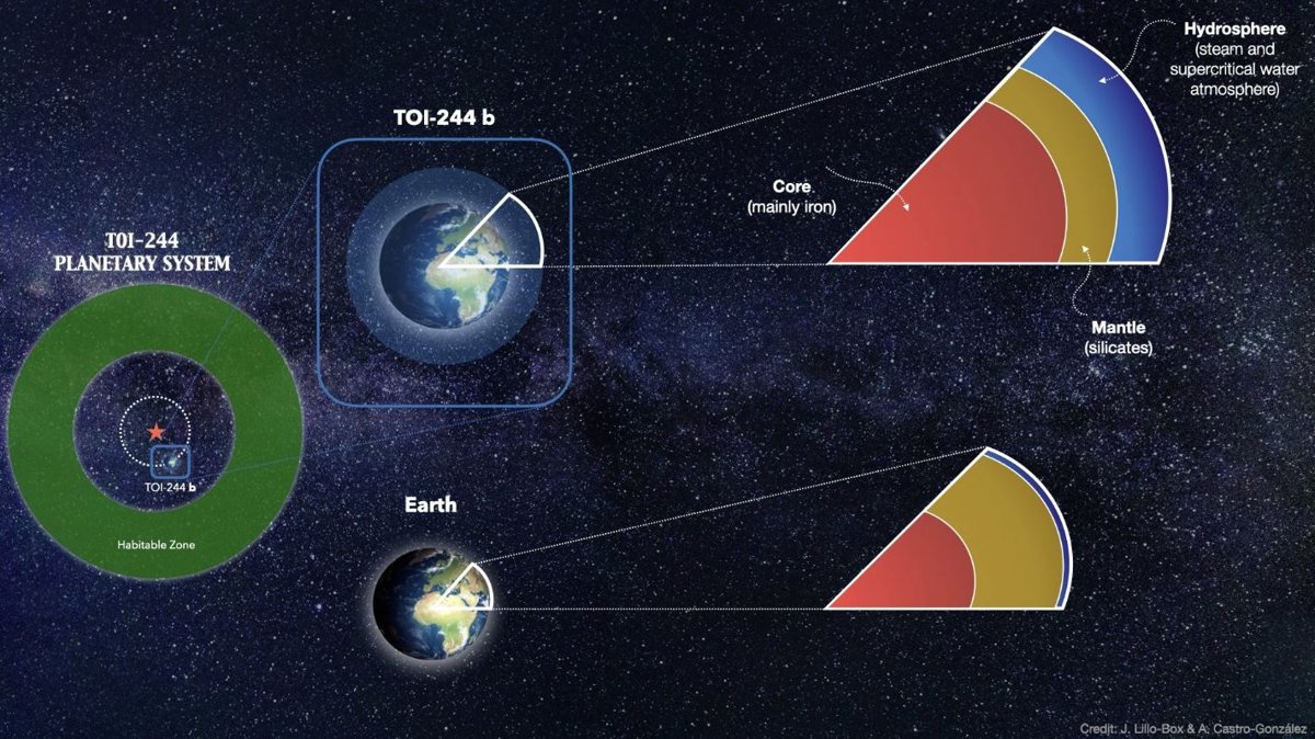 "Investigamos si una densidad tan baja podría explicarse por una escasez de hierro en el núcleo del planeta o por la presencia de una cantidad significativa de elementos volátiles como el hidrógeno, el helio y el agua y descubrimos que TOI-244 b podría tener una hidrosfera de 500 kilómetros de espesor compuesta de vapor y agua supercrítica", explica en su cuenta de Twitter Amadeo Castro-González, estudiante de doctorado en el Centro de Astrobiología de España (CAB) y primer autor de la investigación.