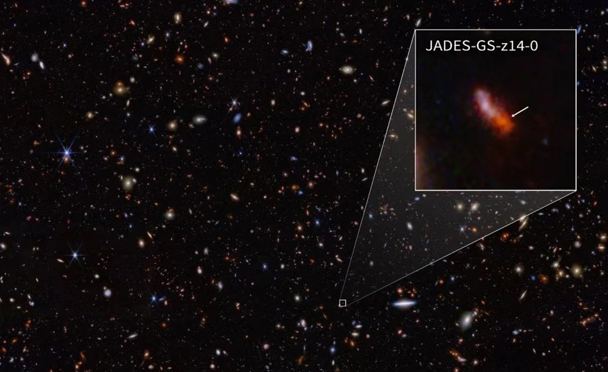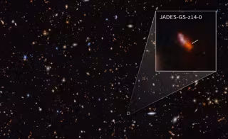 Esta galaxia, JADES-GS-z14-0 (mostrada en la imagen desplegable), es una de las más distantes jamás observadas con el JWST. Según este último estudio, podría albergar una estrella oscura supermasiva en su núcleo. - NASA, ESA, CSA, STSCI