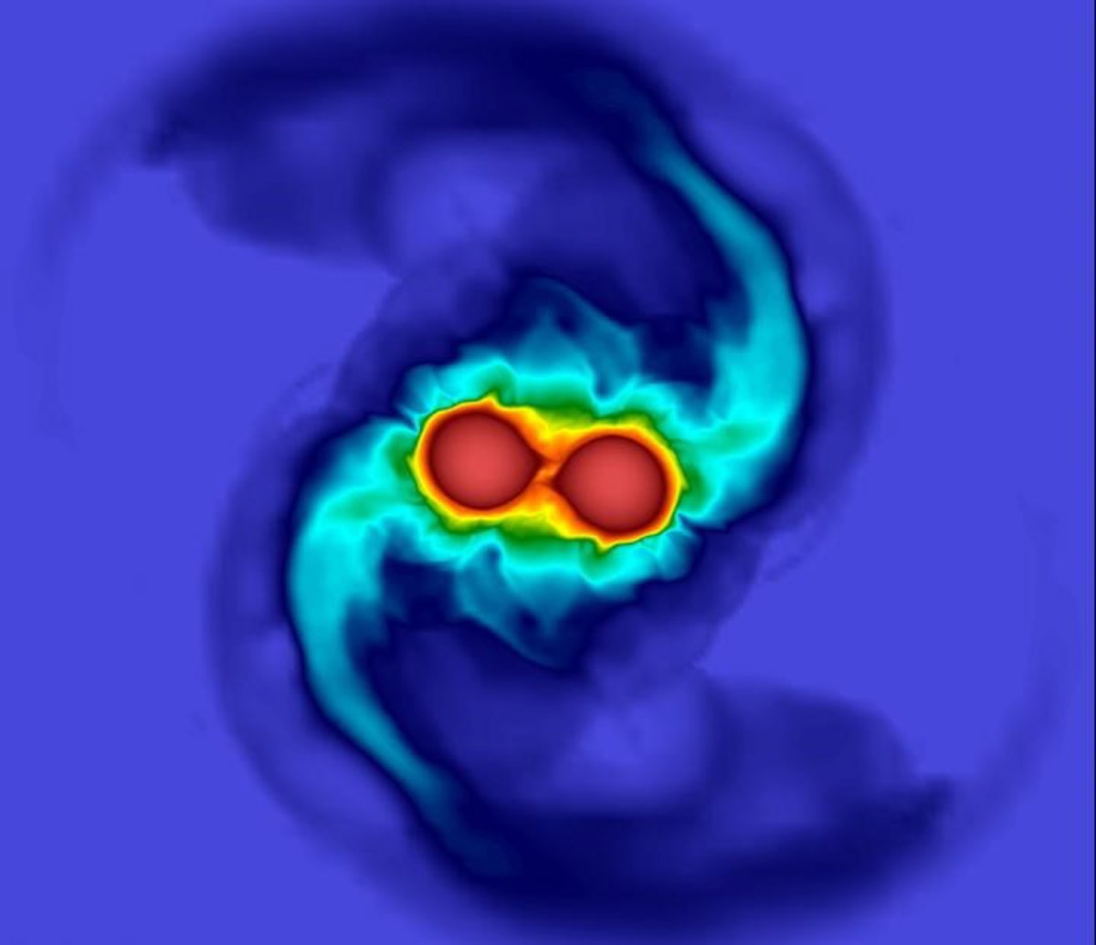 Los resultados de una simulación de la fusión de dos estrellas de neutrones similar al de un evento de onda gravitacional. - University of Birmingham