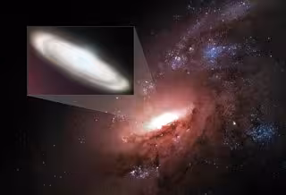 Concepción artística que ilustra un disco de gas que contiene agua en órbita alrededor del agujero negro supermasivo en el núcleo de una galaxia distante. - SOPHIA DAGNELLO, NRAO/AUI/NSF