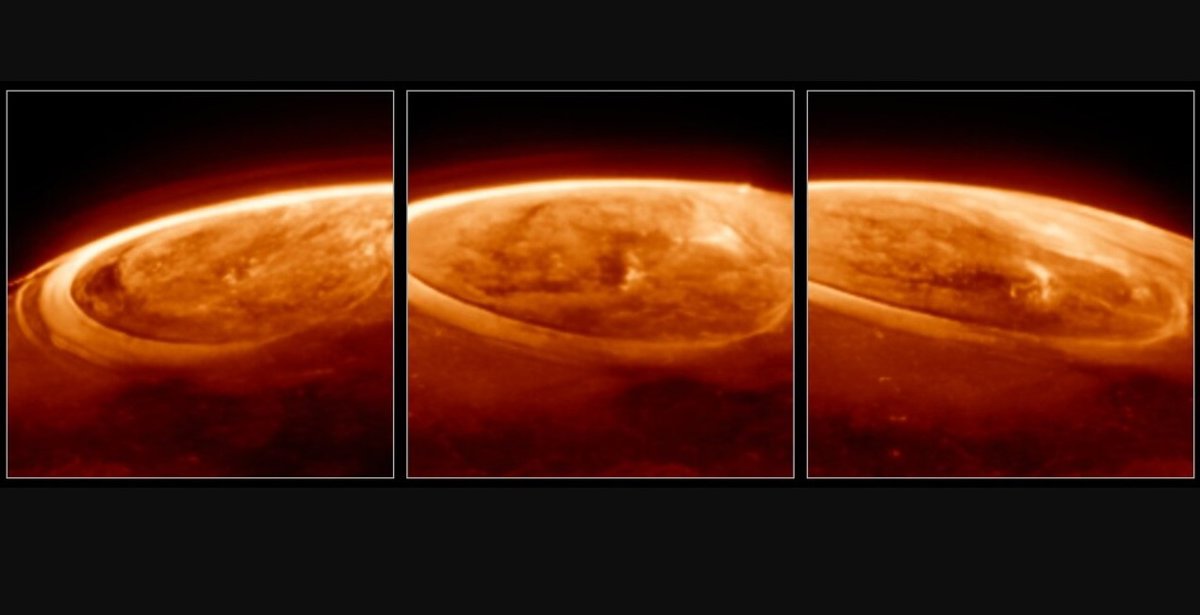 Ahora, las capacidades únicas del Webb están proporcionando nuevos conocimientos sobre las auroras de Júpiter. La sensibilidad del telescopio permite a los astrónomos aumentar la velocidad de obturación para capturar las características aurorales de rápida variación. Los nuevos datos fueron capturados con la Cámara de Infrarrojo Cercano (NIRCam) del Webb el día de Navidad de 2023 por un equipo de científicos dirigido por Jonathan Nichols, de la Universidad de Leicester, en el Reino Unido.