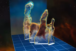 Sin embargo, los grumos más densos de gas y polvo pueden resistir esta erosión durante más tiempo. Detrás de estos grumos más gruesos de polvo, el material está protegido del duro y fulminante fulgor de las estrellas O y B. Este blindaje crea oscuras "colas" o "trompas de elefante", y es lo que vemos como el cuerpo oscuro de un pilar que apunta hacia las brillantes estrellas.