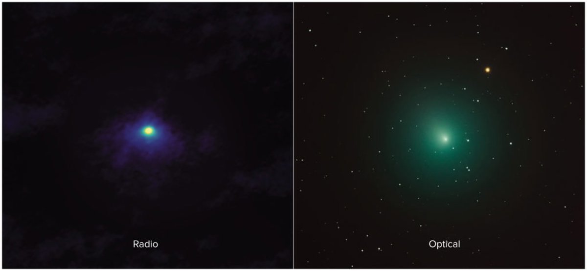 A modo de comparación, se muestra una vista óptica del cometa tomada por un astrofotógrafo aficionado. Aunque parecen ser similares, la imagen de ALMA abarca un área del cielo solo unos 5 segundos de arco, unas 1.000 veces más pequeña que la imagen óptica, lo que significa que ALMA está observando las características de escala muy fina en el coma.