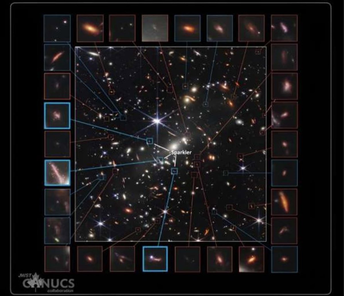 El equipo CANUCS ya ha realizado un hallazgo sorprendente dentro de uno de estos cúmulos: la magnífica galaxia Sparkler. Descubierta en septiembre de 2022, es una galaxia muy ampliada, a unos 9.000 millones de años luz de distancia, repleta de lo que parecen ser los cúmulos de estrellas más antiguos que se formaron después del Big Bang.