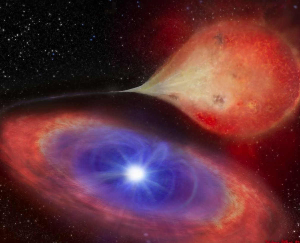 El ejemplo de la impresión de un artista de una enana blanca, en esta imagen, la enana blanca MV Lyrae, se acumula a medida que extrae material de una estrella compañera. - HELENA UTHAS