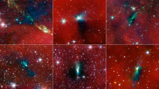 Seis imágenes tomadas por el telescopio Spitzer en las que estrellas binarias forman envolturas asimétricas - NASA/JPL-CALTECH/U.MICHIGAN