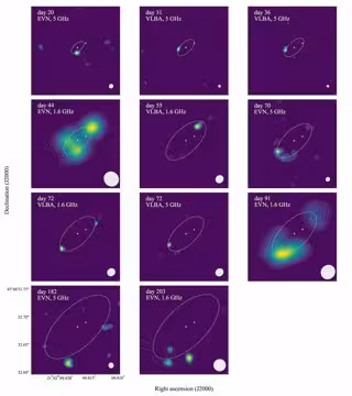 Los astrónomos han publicado ahora los resultados de su campaña VLBI llevada a cabo durante la explosión espectacular que produjo los rayos gamma. Las imágenes, compiladas utilizando las ondas de radio detectadas por telescopios en Europa y en Estados Unidos, son las más detalladas hasta la fecha, y revelan las consecuencias de una poderosa explosión cósmica debido a la interacción de dos estrellas en órbita cercana.